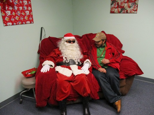 Antonia holding up a sign saying hung with care A room at BSS decorated for Christmas Christmas pictures decorating the wall Johnathon and Fruitopia Blind Santa and Johnathon Kelly handing a Christmas present to Amanda Kelly and the Christmas Teddy Bear Kelly taking Christmas pictures at the party Miss Lolita Miss Lolita and Blind Santa
