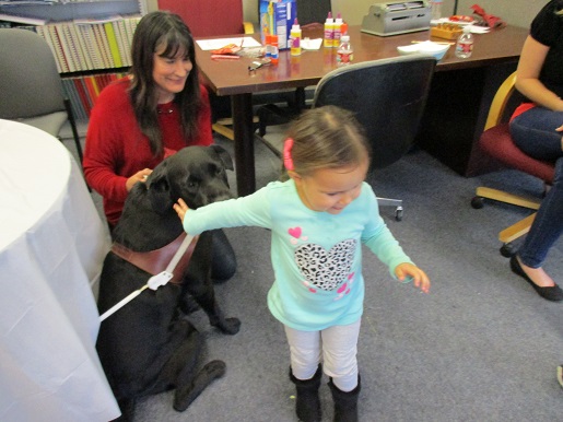 A mother and her blind child Geoff and the BSS Christmas tree A woman posing with Blind Santa Blind Santa and a man sitting together Christine and Bronxie with a little girl A blind child touching Bronxie the guide dog A blind child with Bronxie A little girl at the Braille table A little girl and her mother Priscilla and a blind child doing Braille