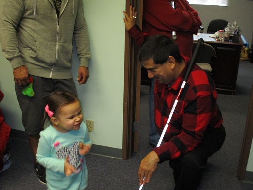 A family at the Christmas party A little girl playing with the sound makers A family at the Christmas party A blind child is listening to the sound maker as part of the tactile learning process A mother and her child are playing with the sound makers A blind child is investigating the sound makers with her ears Dolores and her baby with Blind Santa Santa posing with a Mother and Daughter Blind Santa and a blind child Blind Santa and a blind child