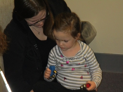 Playing with sound makers at the Christmas party A child is playing with bells and sound makers A child is playing with bongos, bells and maracas A mother and daughter are playing with toys that make sound A child is playing with toys that make sound Everyone is eating lunch in the pancake room A little girl at the Christmas party A little girl at the Christmas party A woman at the Christmas party A family sitting on a blanket